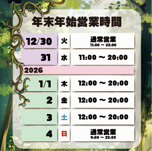 | 営業時間 | 月~金曜まで 13:00~22:00 土・日・祝日 9:00~22:00 |